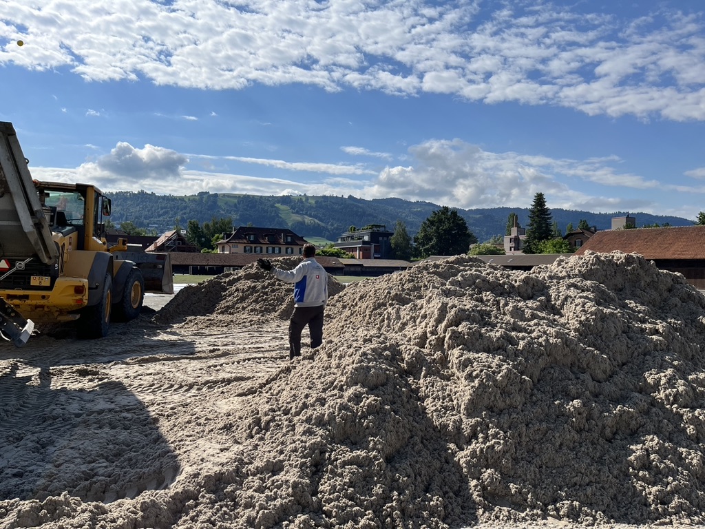 Unsere Turnier-Tretschicht besteht aus einer sorgfältig abgestimmten Mischung aus Sand, Geotextil und Fasern – speziell entwickelt für temporäre Reitplatznutzung auf Turnieren.